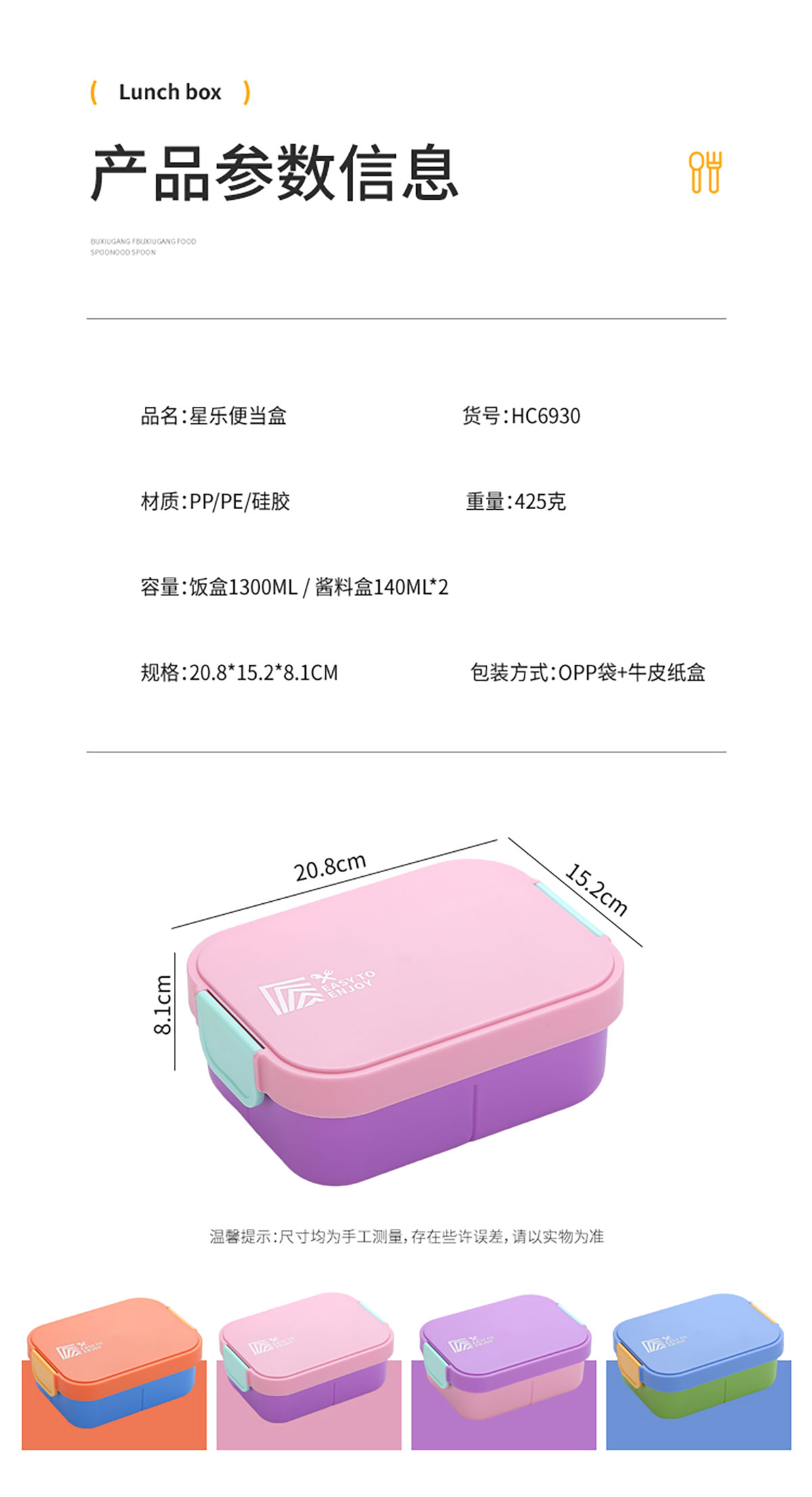 Size: 208*152*81mm/飯盒1300ml/醬料盒140ml