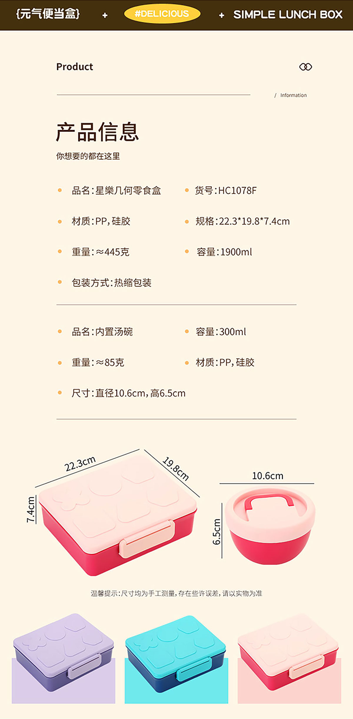 Size: 飯盒:223*198*74mm/1900ml 湯碗:直徑106*高65mm/300ml